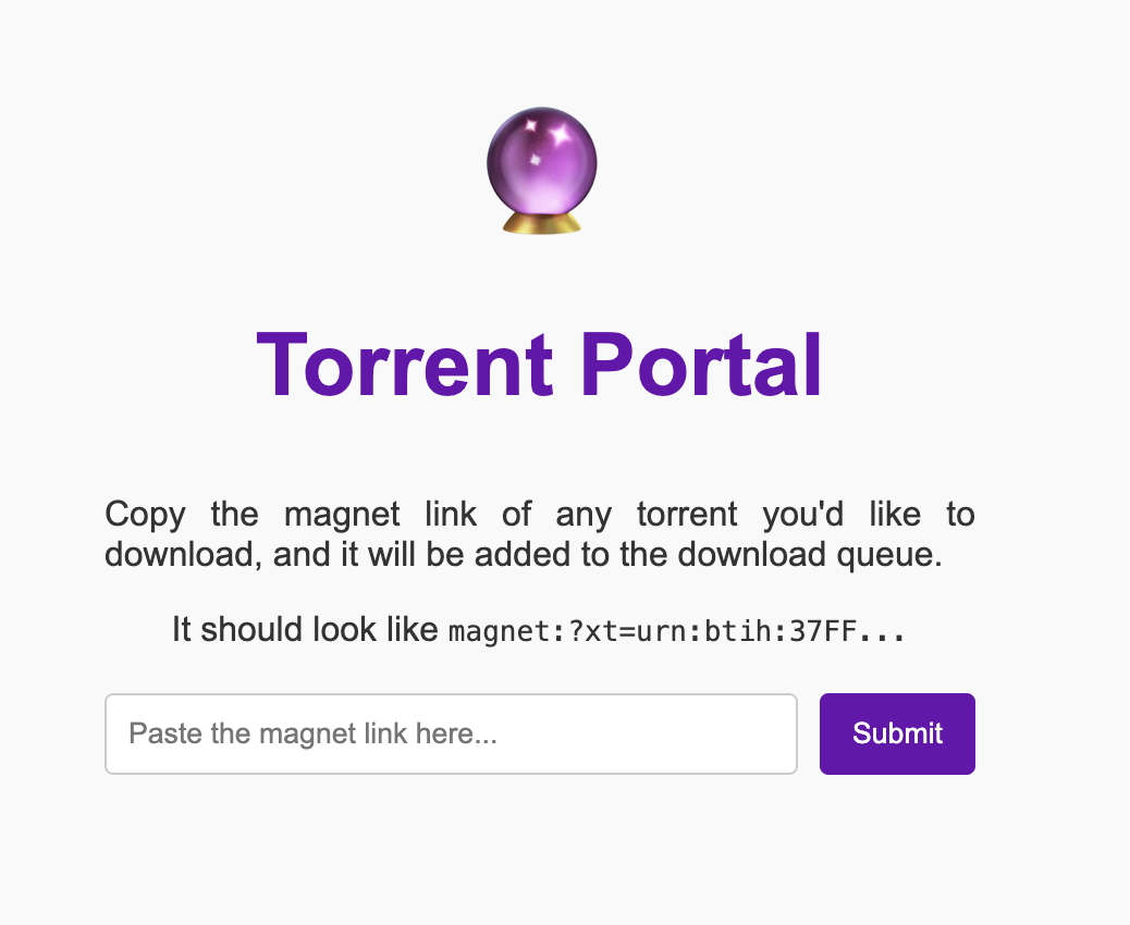 A simplified interface to drop a magnet link and have it automatically loaded into my torrenting client, Transmission. Challenge to myself to build a simple web application using only FastAPI and HTML/CSS.
